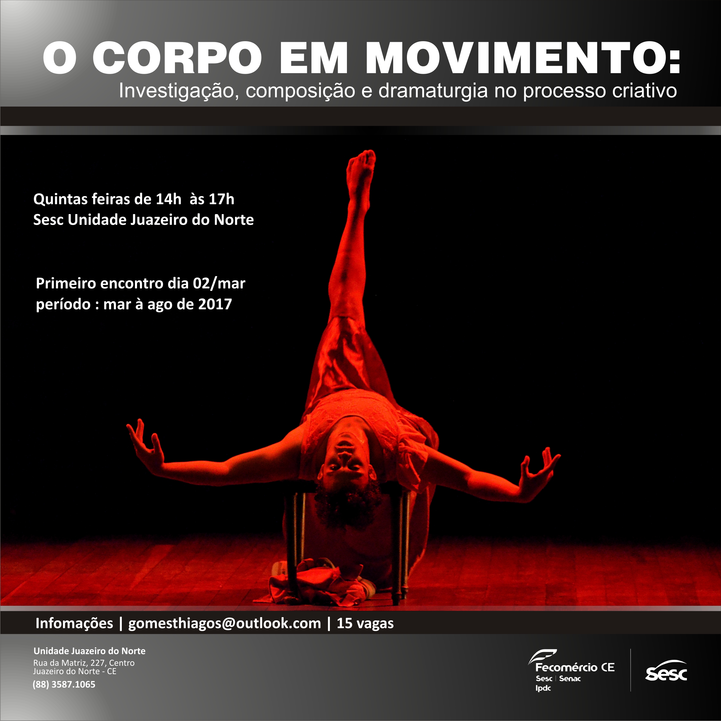 Graduado no Curso de Licenciatura em Teatro da Universidade Regional do Cariri (URCA). Mestre em Artes pela Universidade Regional do Cariri (URCA). Professor Efetivo na Secretaria de Educação do Ceará. Participou como bolsista no Projeto de Pesquisa "Pedagogia do Ator e Pedagogia do Teatro em Diálogo" (PIBIC/URCA) no ano de 2017. Encenador/Intérprete-Criador no Coletivo Dama Vermelha (2013-). Intérprete-criador na Inspire Cia. de Dança (2013-). Participou como bailarino na Cia. Alysson Amancio (2013-2015). Participou do Núcleo de Estudos e Experimentos Teatrais – Sesc Juazeiro do Norte (2010-2014). Foi bolsista no Programa de Extensão “O Prazer da Arte” – Linha Dança Educação - GPEACC (2013-2014) e no Programa Institucional de Bolsas de Iniciação à Docência (PIBID/Teatro). Desenvolve pesquisas no hibridismo entre Dança Contemporânea, Teatro e Performance.https://thiagogomez.jimdofree.com/